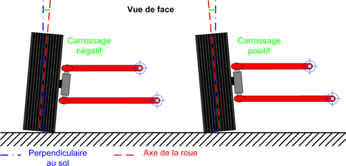 Correspond à l'angle d'inclinaison de la roue par rapport à un plan vertical perpendiculaire au sol. Il est positif si la roue penche vers l'extérieur de la voiture, et négatif dans le cas contraire.
