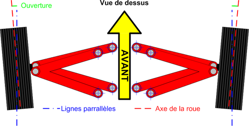 - Effet de l'ouverture à l'avant : la voiture sera plus directive du fait d'un angle de braquage plus important. Elle sera donc plus facile en entrée de virage mais moins en sortie de virage et on perd en stabilité.