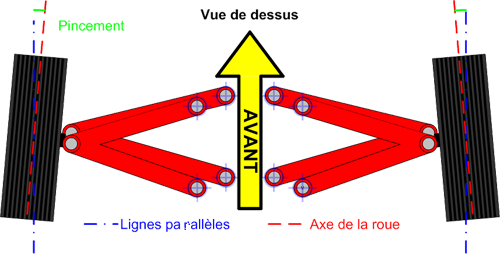 Le pincement : c'est l'angle que fait la roue par rapport à l'axe longitudinal de la voiture, vu du dessus. On parle de pincement lorsque les roues semblent converger vers l'avant de la voiture. Dans le cas contraire, on appelle cela l'ouverture.