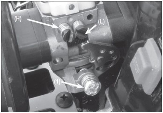 - Vis H et vis L ouvertes à 1 tour 1/4, ajuster ensuite le ralenti pour qu'il soit stable et pas trop élevé. Le réglage des vis de pointe(H) et de reprise(L) agissent sur le ralenti ; il augmente ou descend si on ferme ou si on ouvre.